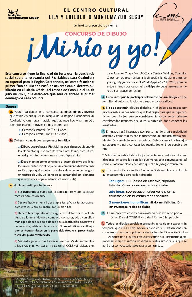 El Centro Cultural Lily y Edilberto Montemayor Seguy te invita a participar en el concurso¡Mi río y yo!Con motivo de fortalecer la conciencia social sobre la relevancia del Río Sabinas, participa hasta el viernes 29 de septiembre a las 6:00 pm.Premiaciones1er lugar: $1,000.002do lugar: $500.002 menciones honoríficasConsulta las bases de la convocatoria en: https://acortar.link/0I4BGu¡No dejes pasar esta gran oportunidad!